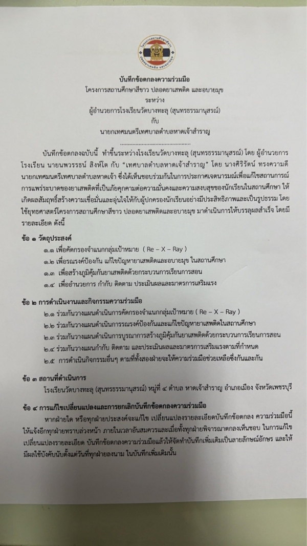 MOU แสดงเจตนารมย์ร่วมกัน กับโรงเรียนวัดบางทะลุ ตามโครงการสถานศึกษา สีขาว